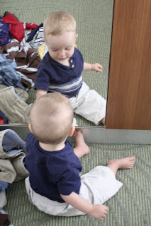 Back in the hotel, Tobin, David, and Jeff (and maybe Josiah?) quickly fell asleep; and things were much better after some rest. But during that time of quiet, I had the pleasure of watching Shav, and I smile just remembering this. There was a full-length mirror on the door of the closet, and he had the best time seeing himself in that mirror. You could tell he was simply enthralled by that little boy he kept seeing--the boy who would wave back at him and smile at him and scoot towards him. It was precious. :)